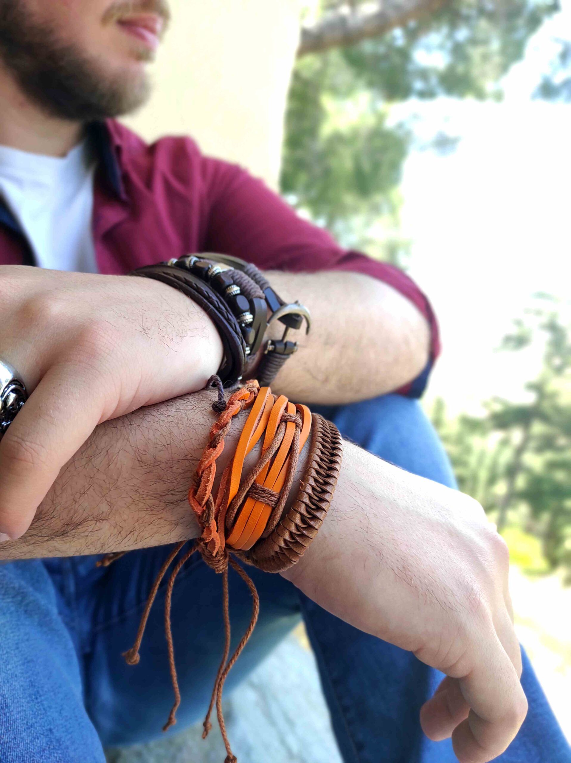 Το σετ αποτελείται από 4 βραχιόλια με δερμάτινα σχέδια και ρουστίκ μεταλλικές λεπτομέρειες, καθώς και ξύλινες χάντρες.